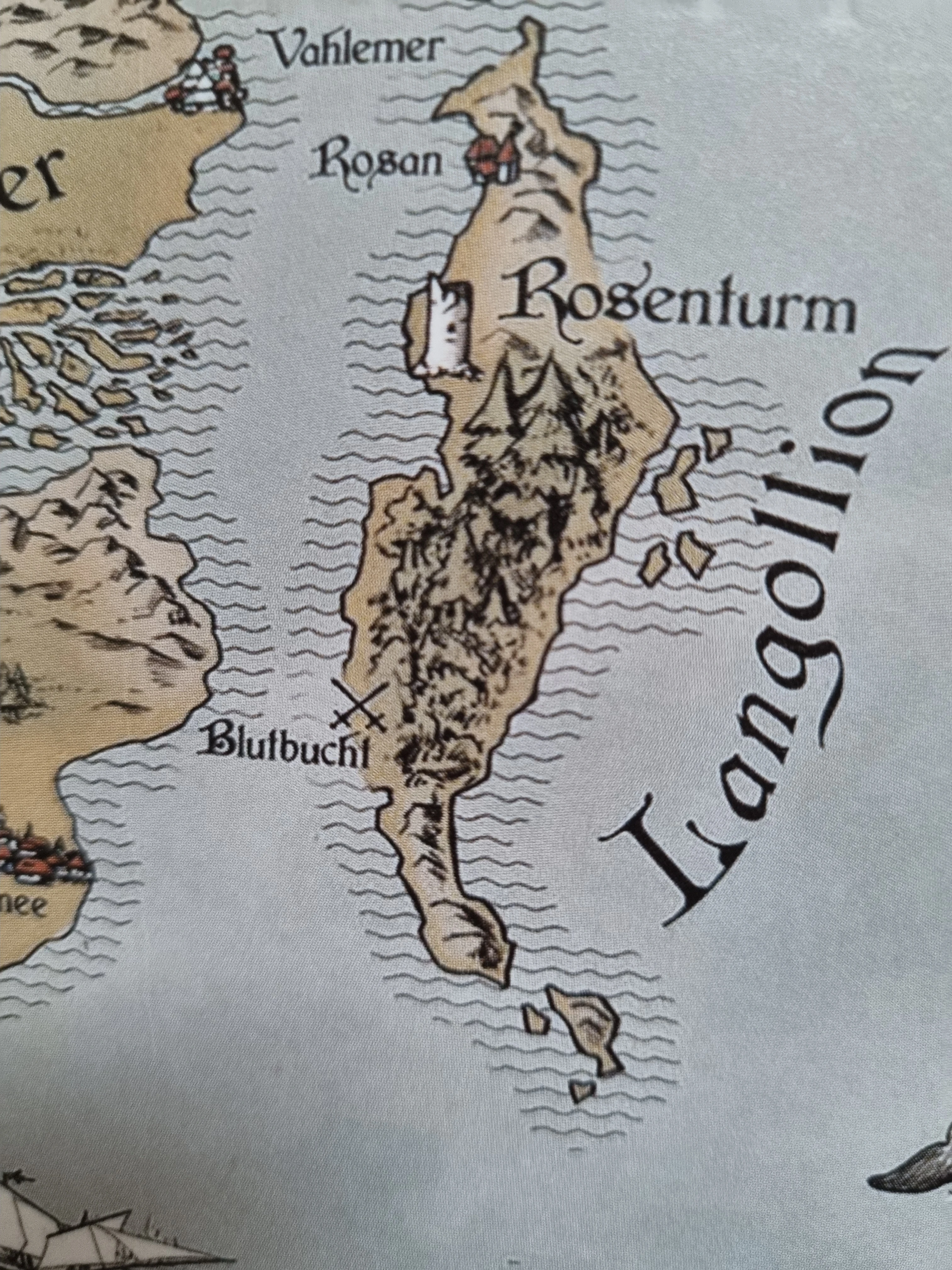 Langollion ist eine langgestreckte Insel vor der Ostküste der nördlichen Albenmark. Sie ist von schroffen Bergen und dunklen Wälder bedeckt.[10]